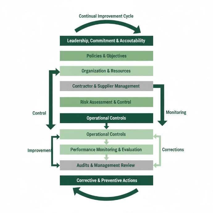 - Regular inspections, internal audits, and management reviews verify compliance and identify areas for improvement. Findings are analyzed and corrective actions tracked to closure.